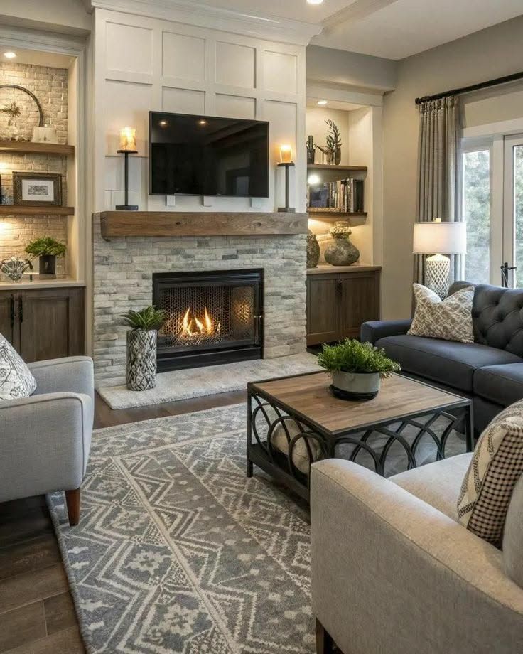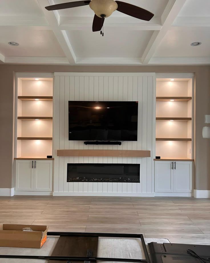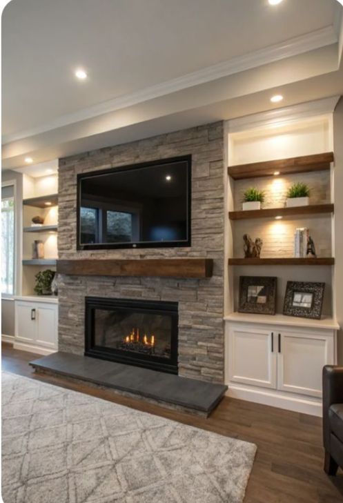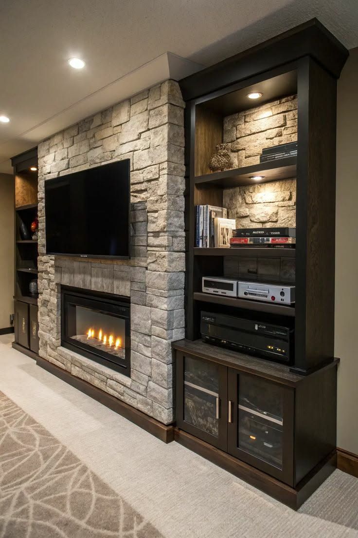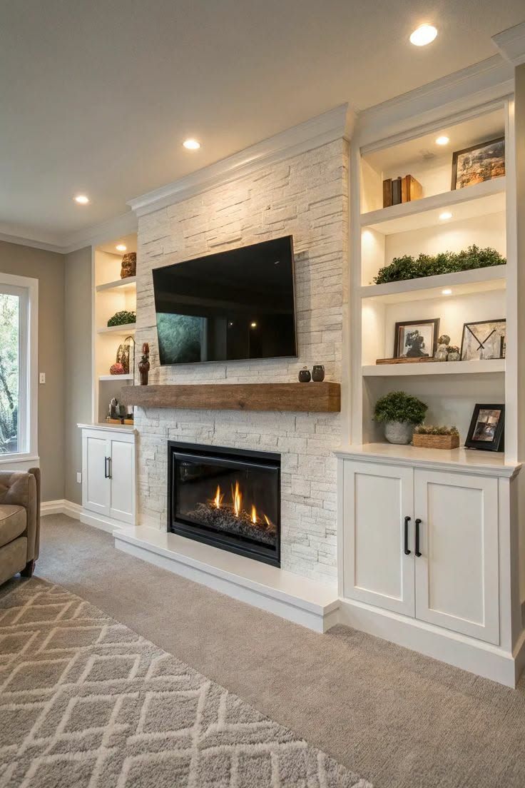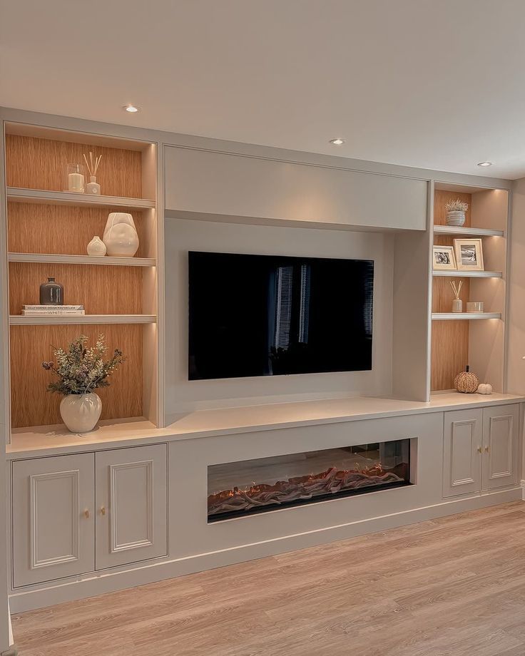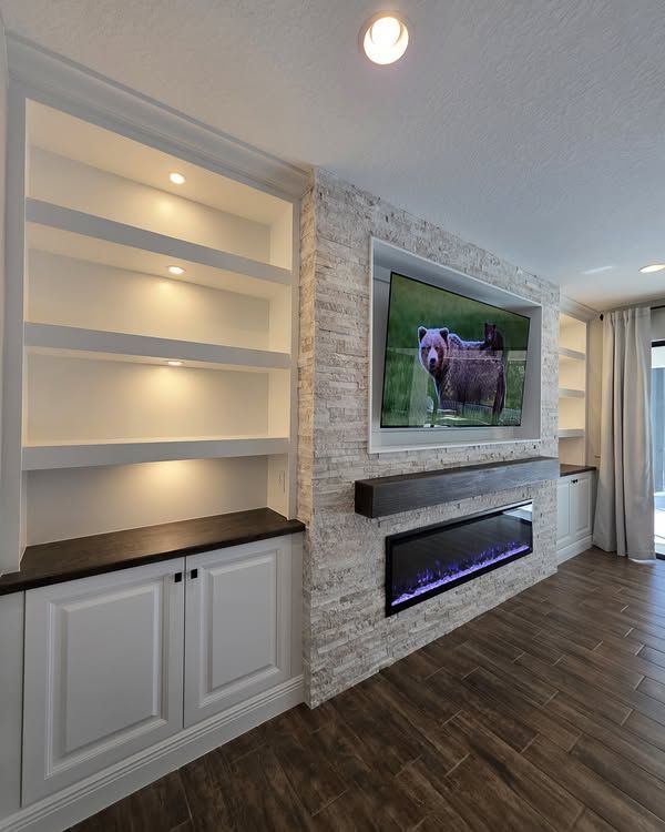 - Custom Media Walls: Transform your living room with a stunning media wall, seamlessly integrating an electric fireplace, built-in shelving, and sleek entertainment features to create a stylish and functional focal point.